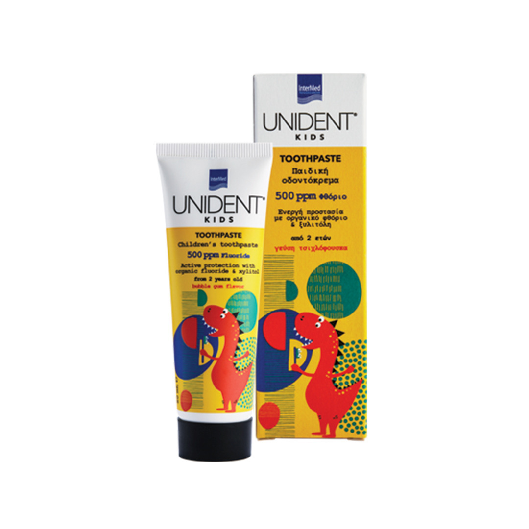 H Unident kids οδοντόκρεμα είναι ειδικά σχεδιασμένη φθοριούχος οδοντόπαστα για την καθημερινή προστασία και την ενδυνάμωση των ευαίσθητων παιδικών δοντιών. Με φθόριο από οργανικά μόρια, για καλύτερη απορρόφηση σε σχέση με αντίστοιχες ανόργανες ενώσεις, προσφέρει αποτελεσματική και μεγάλης διάρκειας προστασία από την τερηδόνα.Η ξυλιτόλη, ένα φυσικό γλυκαντικό, προστατεύει καθημερινά τα δόντια από τα οξέα που προκαλούν τερηδόνα και προλαμβάνει τον σχηματισμό της μικροβιακής πλάκας. Mε υπέροχη γεύση τσιχλόφουσκας !